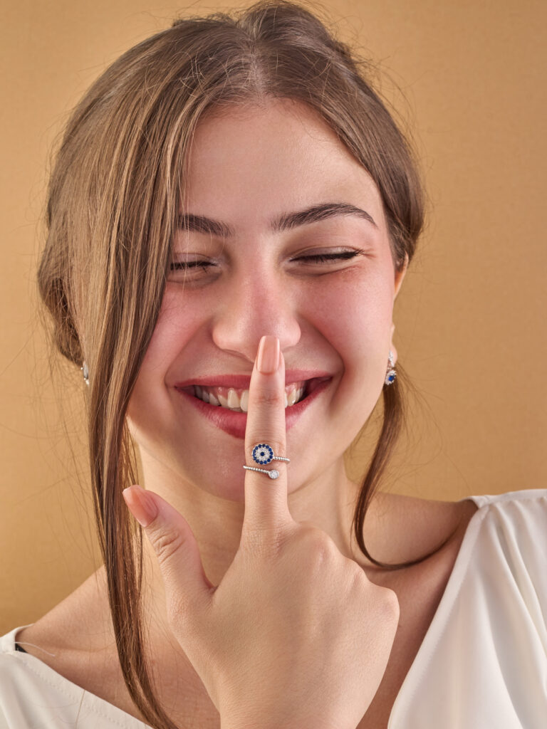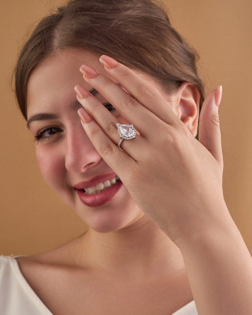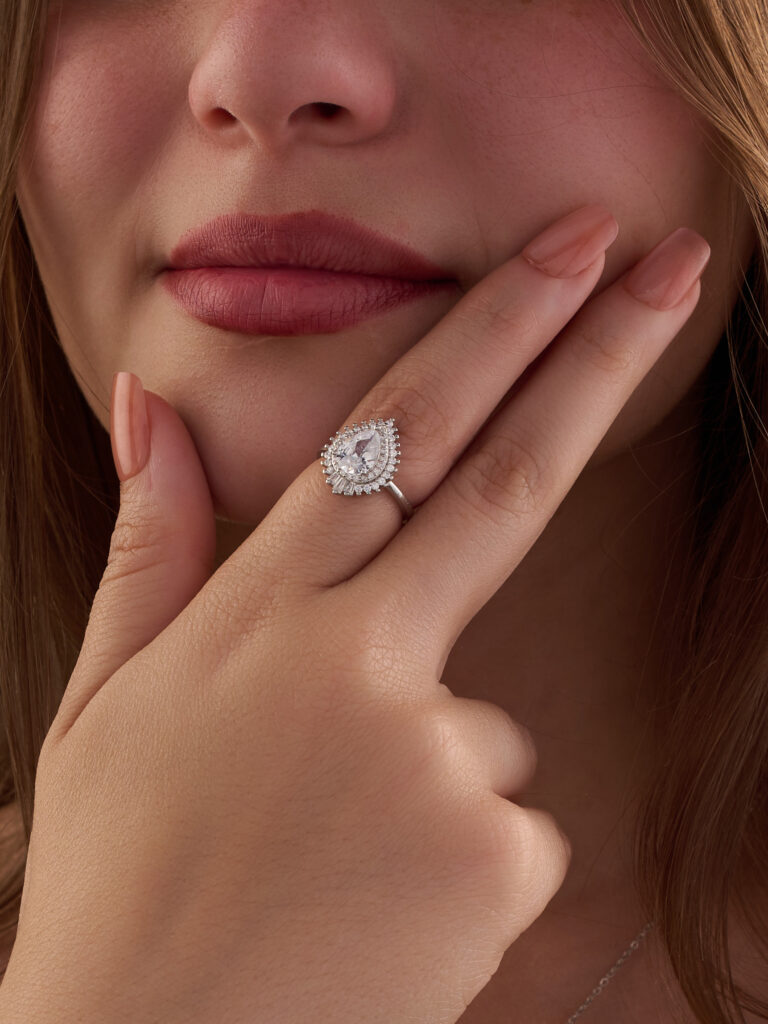 A silver ring in the shape of a water drop, inlaid with white zircon stones.