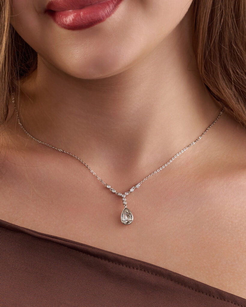 Be the first to review “A simple silver necklace in the shape of the letter Y with an oval pendant inlaid with white zircon stones.”