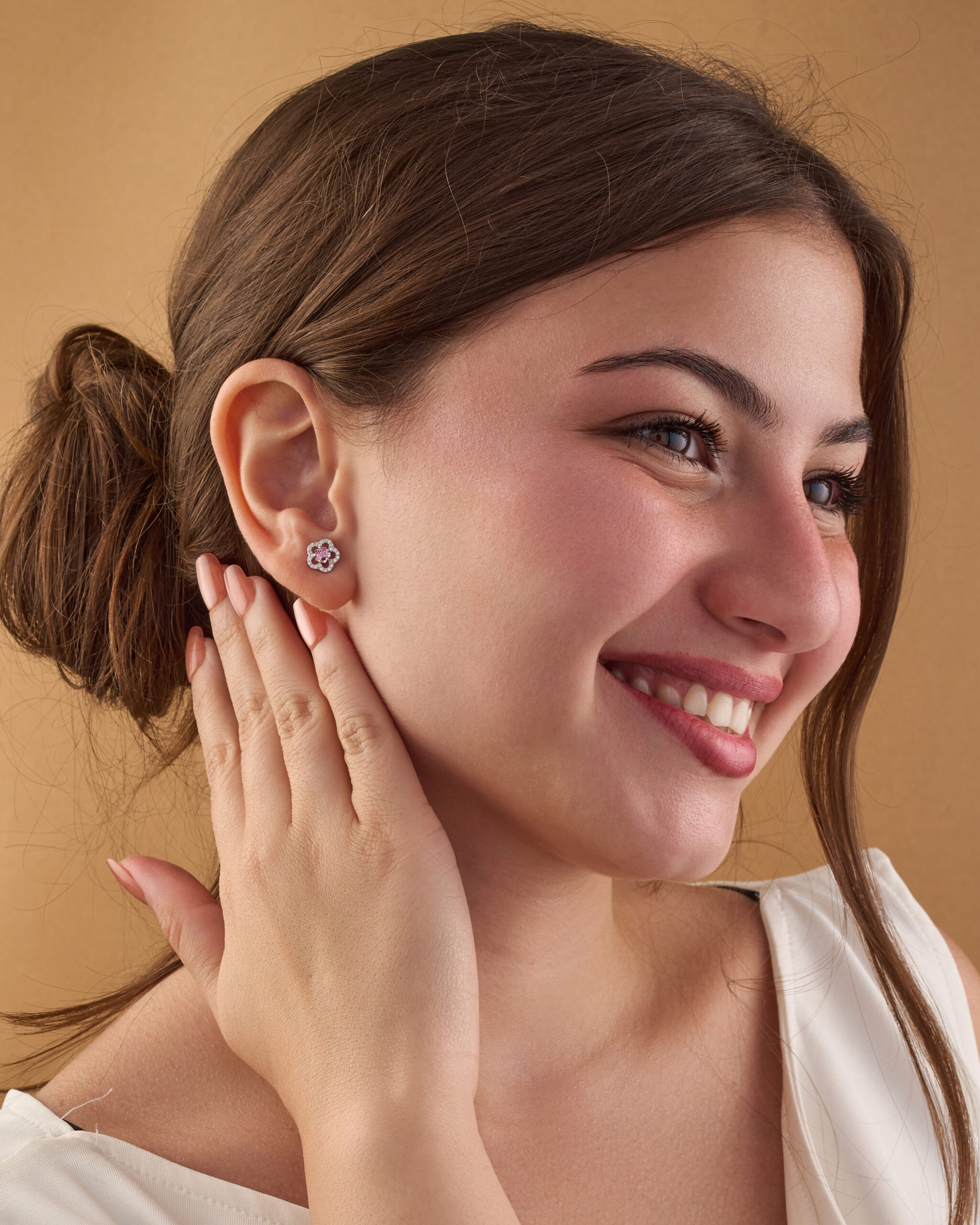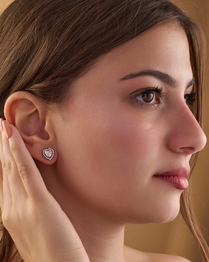 Be the first to review “Silver rose-shaped earring inlaid with white zircon and rose quartz stones”