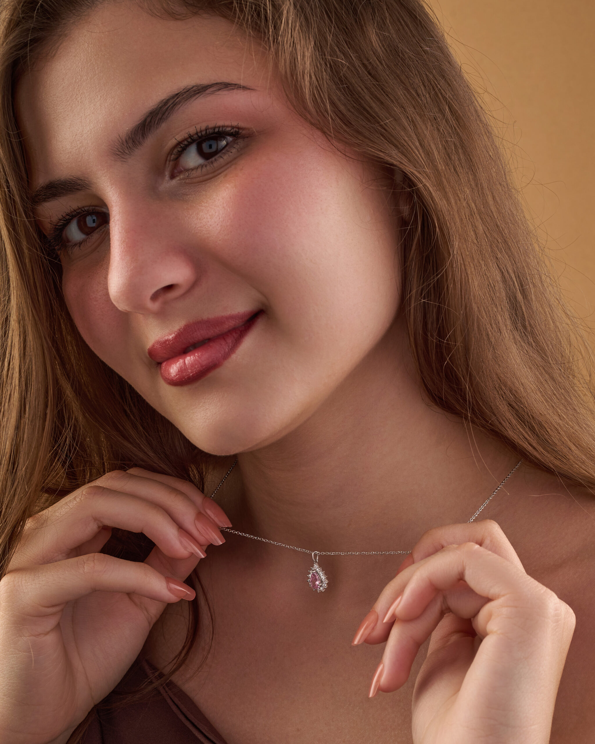 Be the first to review “Simple silver necklace in the shape of a teardrop, inlaid with white zircon and rose quartz stones”