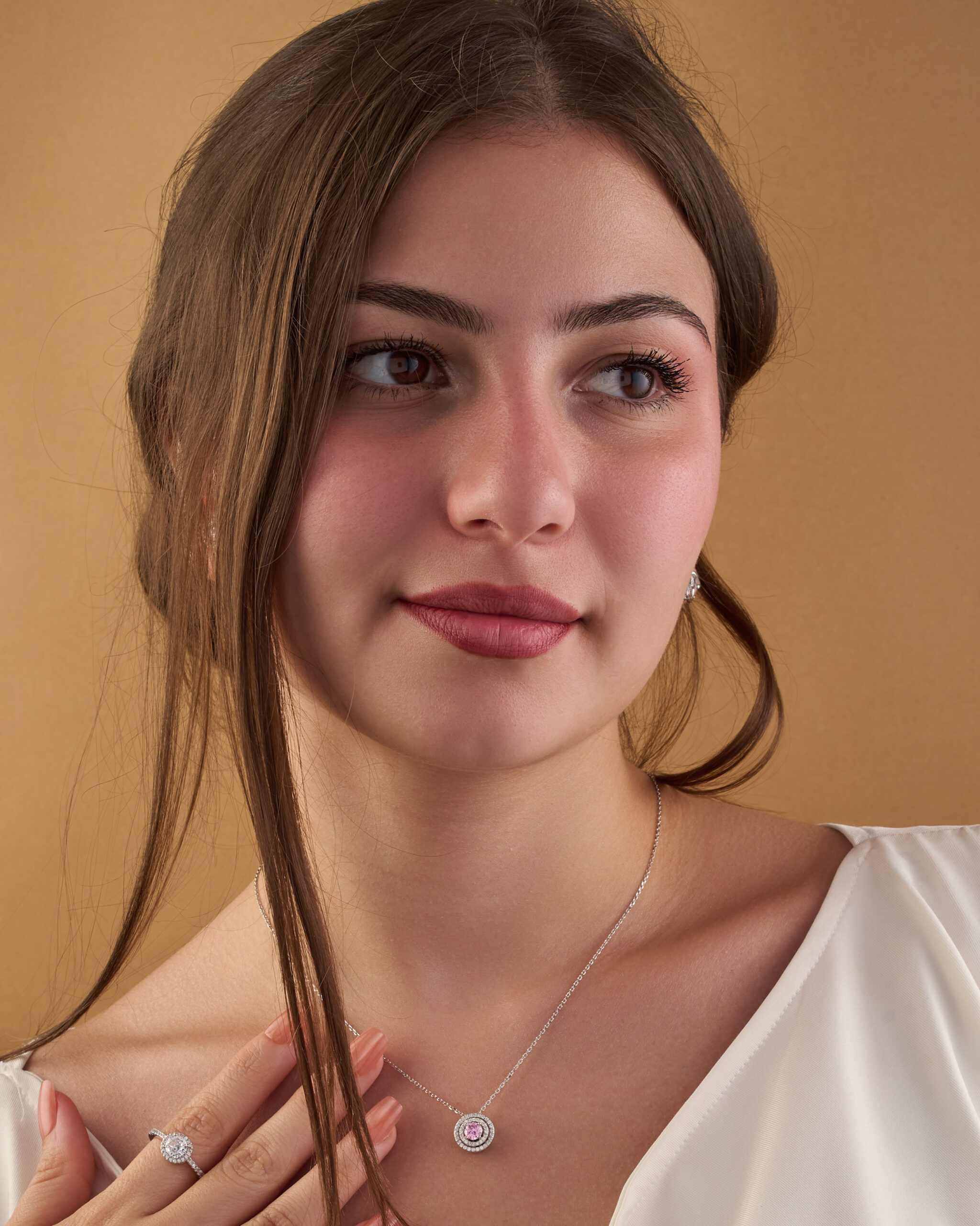 Be the first to review “Simple silver pendant in a circular shape, inlaid with white zircon and rose quartz stones”