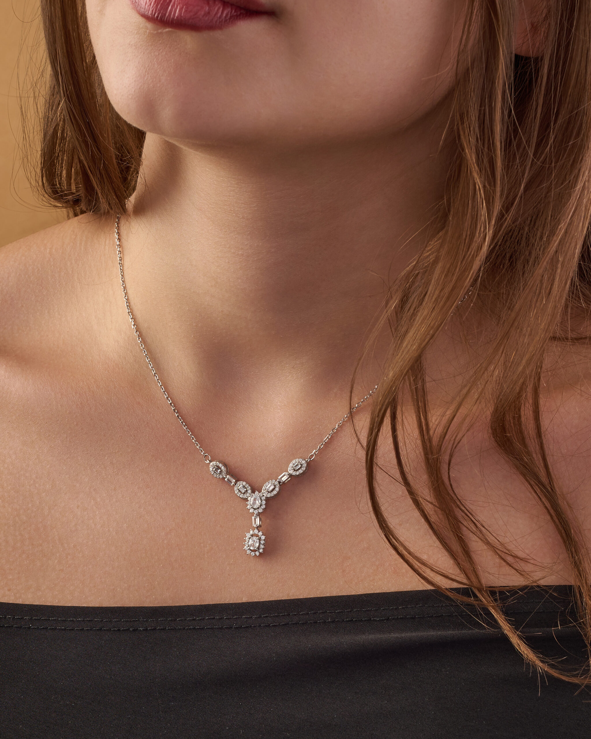 Simple silver Y-shaped pendant inlaid with white zircon stones