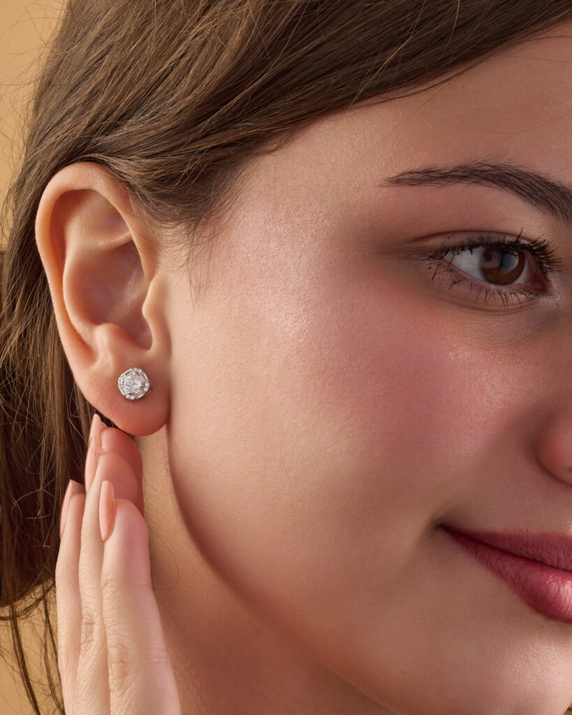 Silver circular earring inlaid with white zircon stones and pearl stones