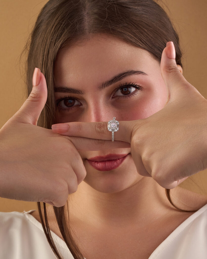 Silver ring in the shape of two spheres, inlaid with white zircon stones